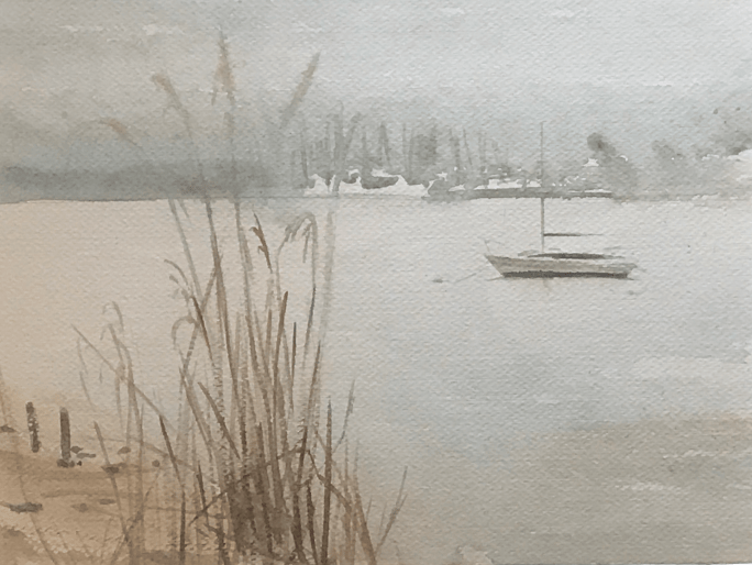 FOG ON HARBOR. Watercolor on Paper, 15″x11″, Framed, Ref# WC11. Location: McShain Studio Gallery, Dennisville, NJ. Original – 1200$ Limited Edition Prints Available Here